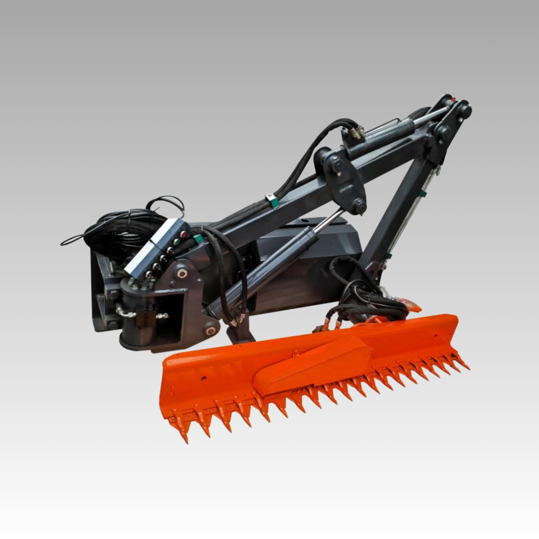 The head rides on an articulated arm that offers three core motions. First, a left-right slew turns the plate into a long-reach hedge cutter for 14-foot tall green walls without backing the loader into beds. Second, a 180-degree wrist rotates the bar for slope work—ditch banks, canal edges, and waterway edge cutter passes that used to require a tractor flail. Third, the boom knuckles in and out, letting operators address topiary shapes or inside turns on radius planters. Combined, the joints earn the attachment a place in municipal bids as an adjustable angle hedge trimmer that replaces two machines (flail and handheld) with one.